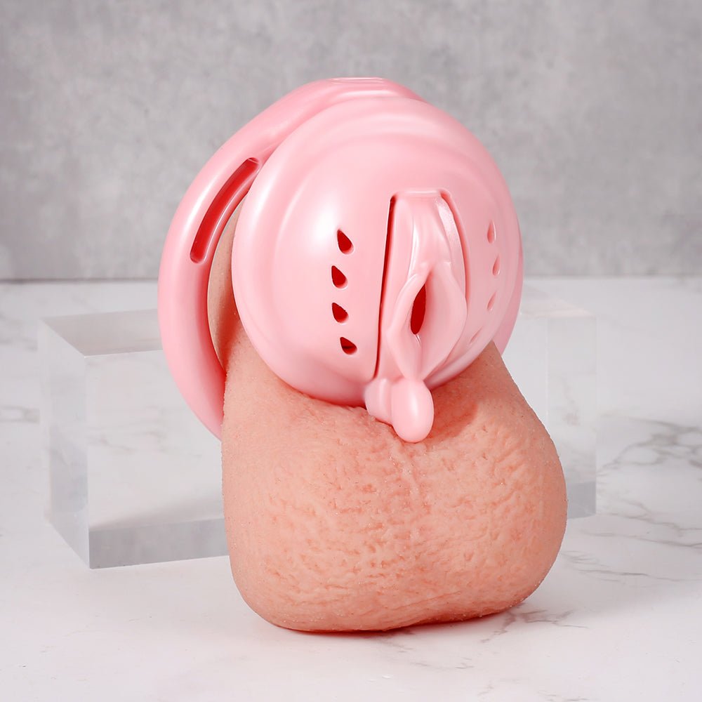 Its smooth pink shell curves around the body, closing with a unique lock system that keeps everything secured inside while leaving the exterior soft, round, and unmistakably restrained.